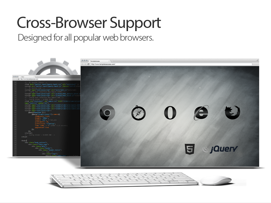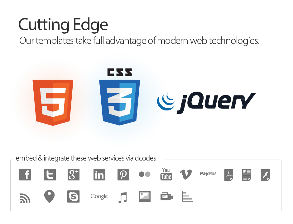 Pages are coded with the latest technologies featuring jQuery, CSS3, HTML 5 and optimized for SEO.